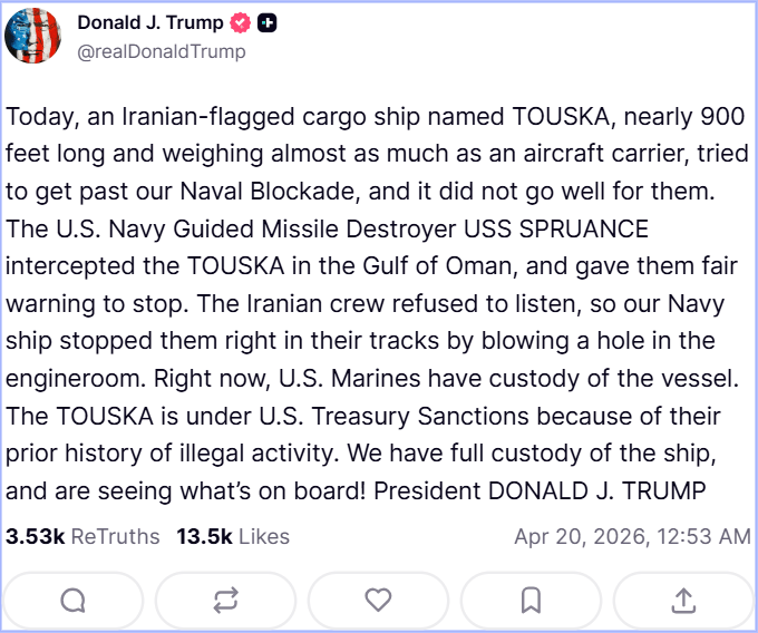ट्रंप ने सोशल मीडिया पर कहा कि इस जहाज को अमेरिकी नौसेना के गाइडेड मिसाइल डेस्ट्रॉयर ने ओमान की खाड़ी में रोका। इसे रुकने की चेतावनी दी गई लेकिन उसने आदेश नहीं माना और इसके बाद नौसेना ने ‘सीधा हमला कर इंजन कक्ष में छेद कर दिया’ और जहाज को रोक दिया।