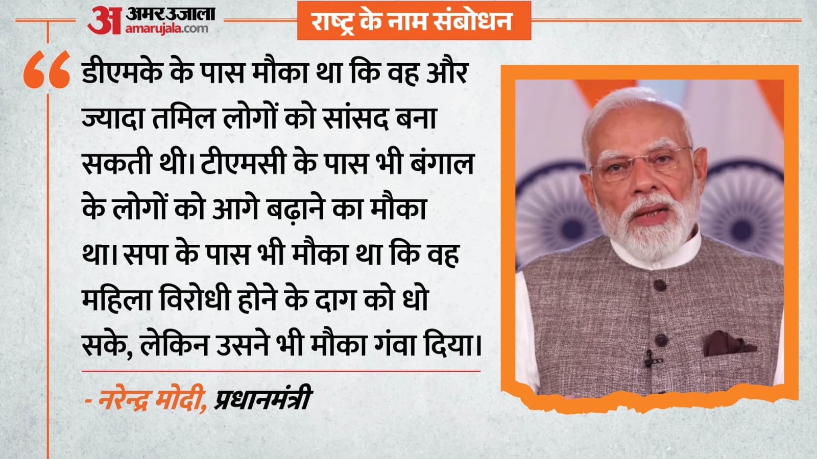 प्रधानमंत्री नरेंद्र मोदी ने शनिवार को राष्ट्र को संबोधित करते हुए देश की माताओं-बहनों से माफी मांगी। उन्होंने कहा, ‘नारी शक्ति वंदन अधिनियम में संशोधन नहीं हो पाया। मैं इसके लिए सभी माताओं-बहनों का क्षमाप्रार्थी हूं। हमारे लिए देश हित सर्वोपरि है, लेकिन कुछ लोगों के लिए जब दल हित देश हित से बड़ा हो जाता है तो नारी शक्ति और देश को इसका खामियाजा उठाना पड़ता है।’ उन्होंने चार दलों- कांग्रेस, डीएमके, टीएमसी और सपा पर विशेषकर निशाना साधा। इसी के साथ द्रमुक को आड़े हाथ लेते हुए तृणमूल कांग्रेस पर निशाना साधते हुए पश्चिम बंगाल का जिक्र किया। तमिलनाडु में 23 अप्रैल को और बंगाल में 23 और 29 अप्रैल को मतदान होना है।