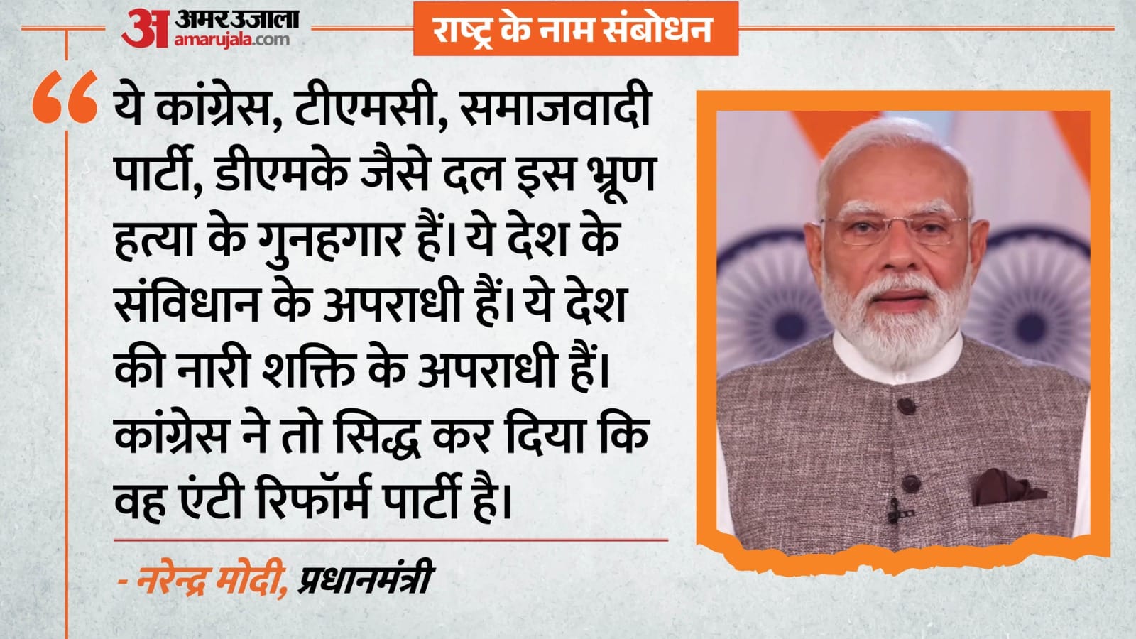 पीएम मोदी ने आगे कहा कि राज्य छोटा हो, बड़ा हो, राज्य की आबादी कम हो, ज्यादा हो। सबकी समान अनुपात में शक्ति बढ़ाने की कोशिश थी, लेकिन इस ईमानदार प्रयास की, कांग्रेस और उसके साथियों ने सदन में पूरे देश के सामने भ्रूण हत्या कर दी है। ये कांग्रेस, टीएमसी, समाजवादी पार्टी, डीएमके जैसे दल इस भ्रूण हत्या के गुनहगार हैं। ये देश के संविधान के अपराधी हैं। ये देश की नारी शक्ति के अपराधी हैं।