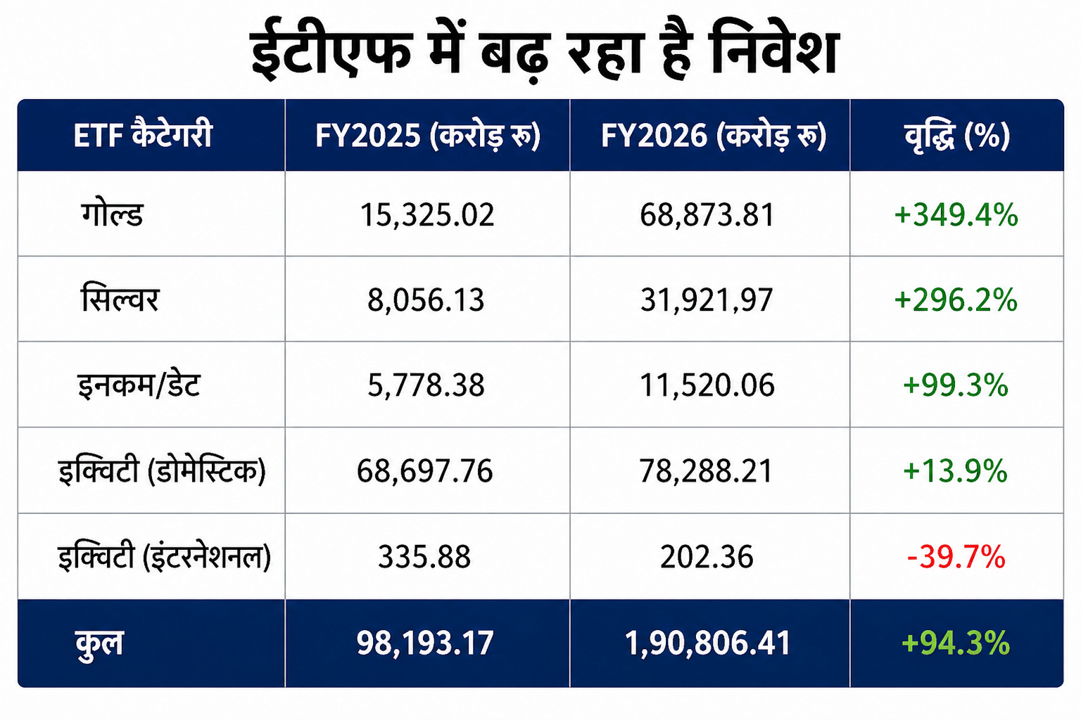 ईटीएफ की दुनिया अब केवल सोने-चांदी तक सीमित नहीं है। ईटीएफ यानी एक्सचेंज ट्रेडेड फंड्स अब निवेश की वह मल्टी-कुजीन थाली बन गई है, जहां आपकी पसंद का हर जायका मौजूद है, चाहे फिर वह बैंकिंग हो, आईटी हो, सरकारी बॉन्ड हो या फिर अमेरिकी शेयर बाजार। भारतीय निवेशकों के बीच पैसिव निवेश की समझ बढ़ रही है। यही वजह है कि वित्त वर्ष 2025-26 में ईटीएफ में निवेश पिछले वित्त वर्ष 2024-25 की तुलना में 94% बढ़ा है।