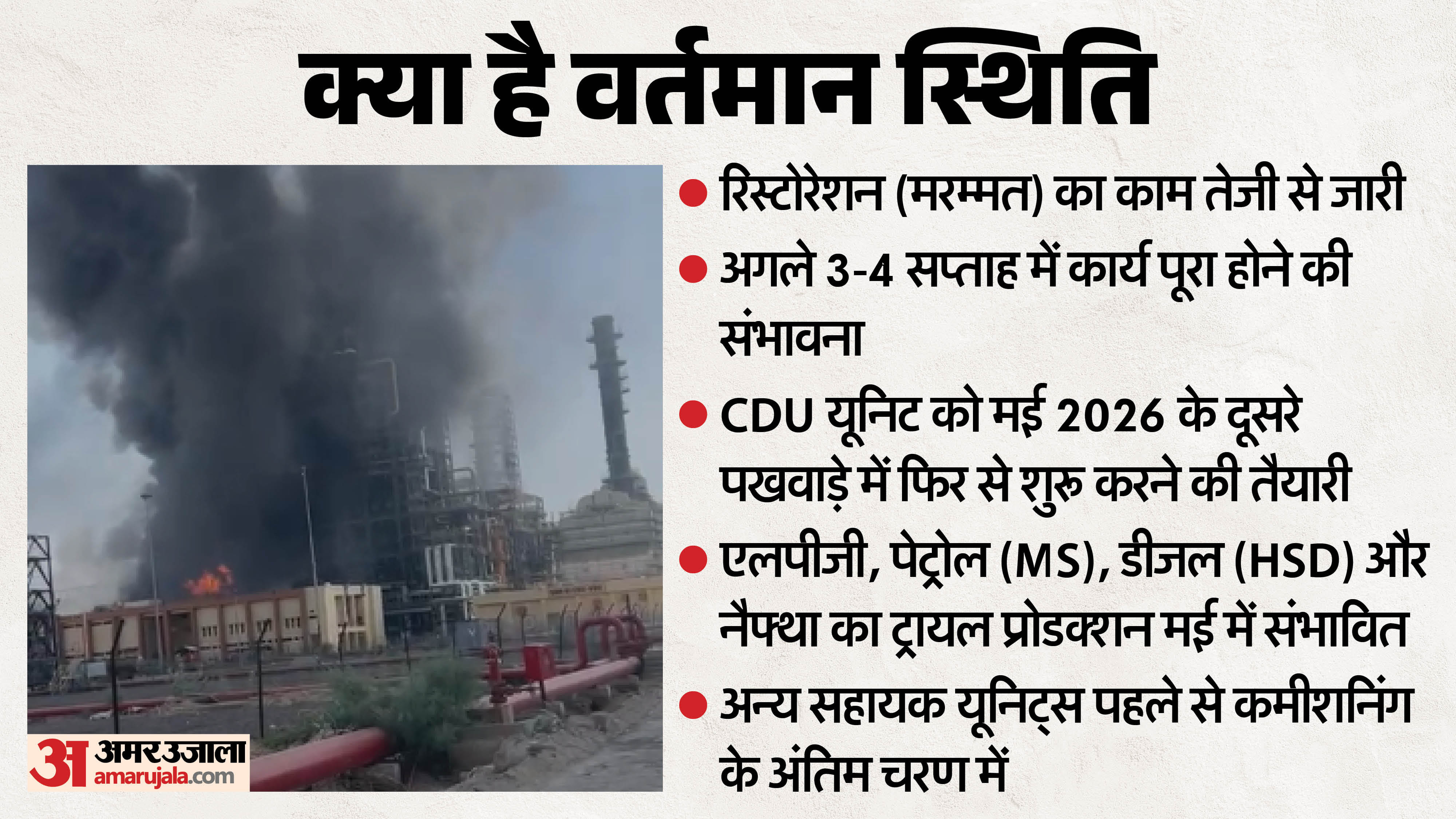 हिन्दुस्तान पेट्रोलियम कॉर्पोरेशन लिमिटेड के मुताबिक, पुनस्थार्पन कार्य जारी है और इसके अगले 3-4 हफ्ते में पूरे होने की संभावना है। सीडीयू यानी क्रूड डिस्टिलेशन यूनिट को मई 2026 के द्वितीय पखवाड़े में शुरू किए जाने की संभावना है। अन्य सहायक इकाइयां योजना के अनुसार पहले से ही कमीशनिंग के उन्नत चरण में हैं। साथ ही संभावना है कि मुख्य उत्पादों (एलपीजी/एमएस/एचएसडी/नैफ्था) का परीक्षणात्मक उत्पादन मई 2026 में प्रारंभ हो जाएगा और इसके पश्चात इकाइयों को स्थिर / कमीशन किया जाएगा।